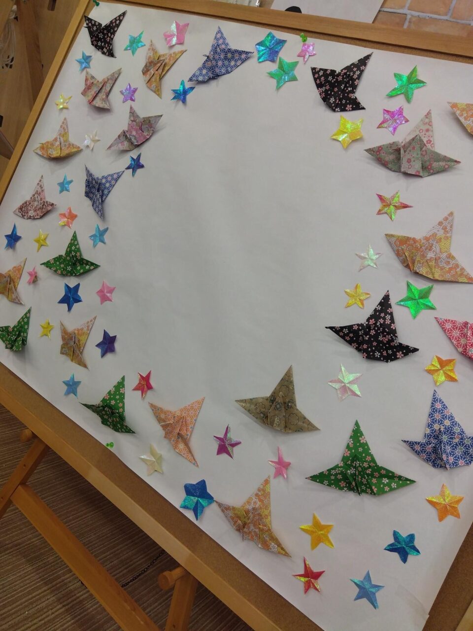 一方の在校生チームは、会場を彩るお花紙や、祝い鶴をあしらったウェルカムボードを制作中。