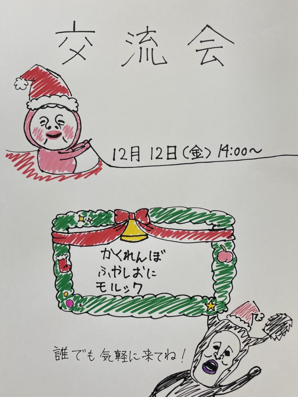 12月の交流会は12月12日(金)14:00~です。ゲームの内容はかくれんぼ・ふやし鬼・モルックです!
