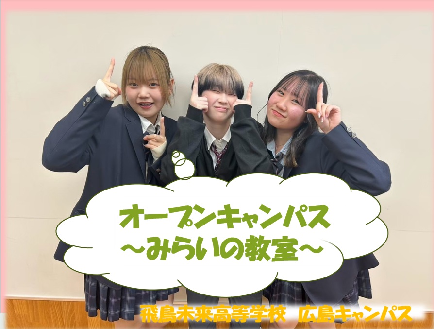 飛鳥未来高等学校(広島キャンパス)は自分らしく、夢に向かって羽ばたく力を身につける事が出来る単位制・通信制の高校です。