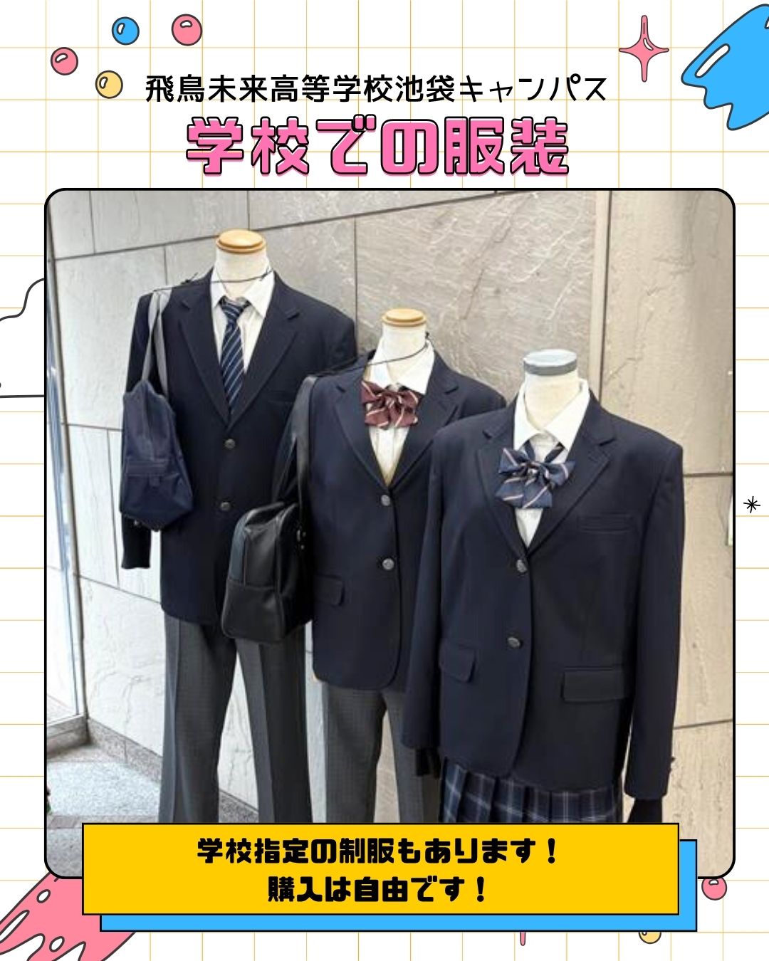 学校指定の制服もあり、購入は自由です。