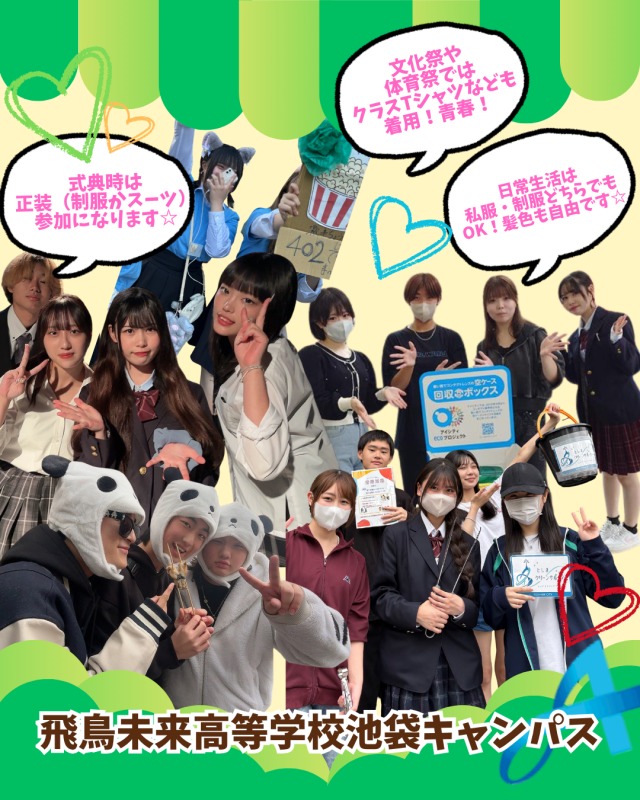 大丈夫です!飛鳥未来高校はあなたらしく学校生活を過ごせるよう服装は自由となっています🙎