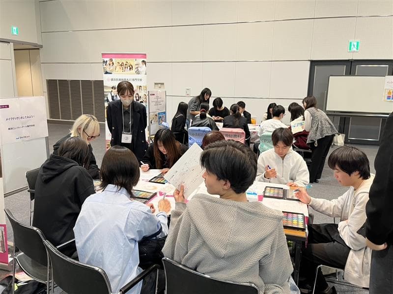 メイク体験のご様子です!美容系に興味がある学生も多く、待ち列ができていました!