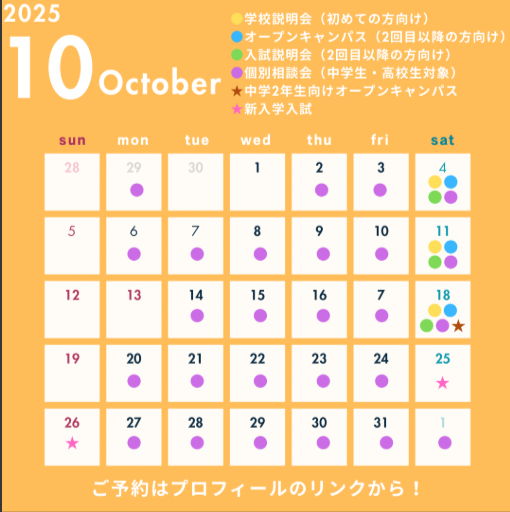 10月も学校説明会、オープンキャンパス、入試説明会などのイベントを実施します👏