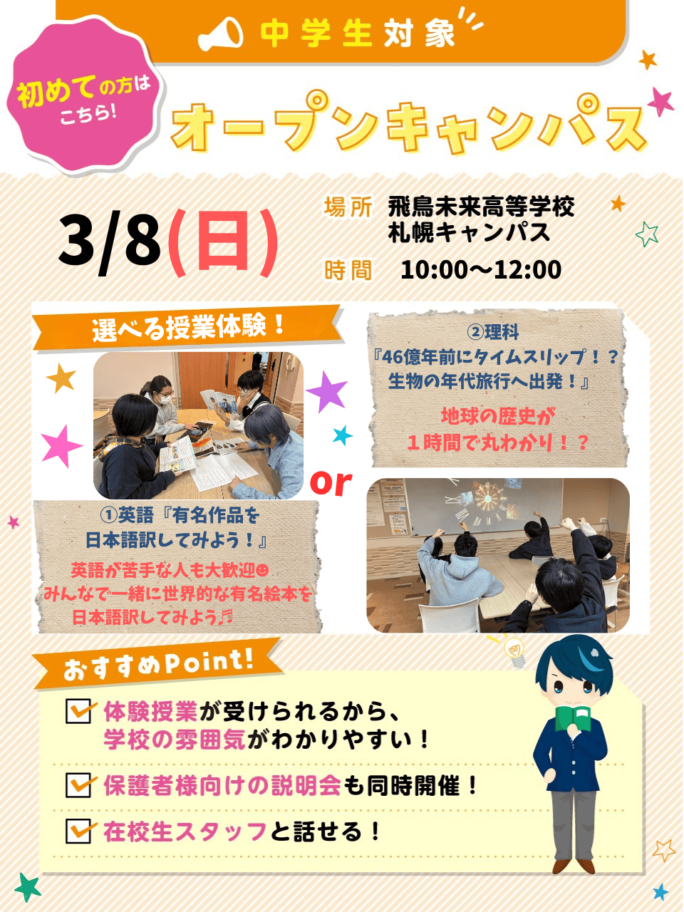 授業体験は希望していないけど、飛鳥未来高校の話のみ聞きたい方は…学校説明会!一人でも、保護者の方と一緒でも、お友達と参加でもOK!