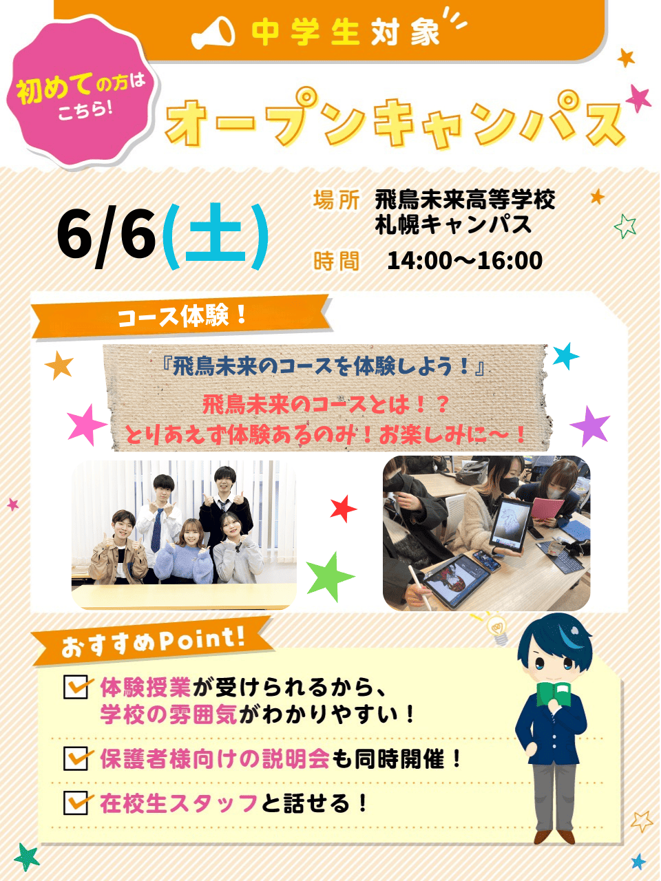 授業体験は希望していないけど、飛鳥未来高校の話のみ聞きたい方は…学校説明会!一人でも、保護者の方と一緒でも、お友達と参加でもOK!