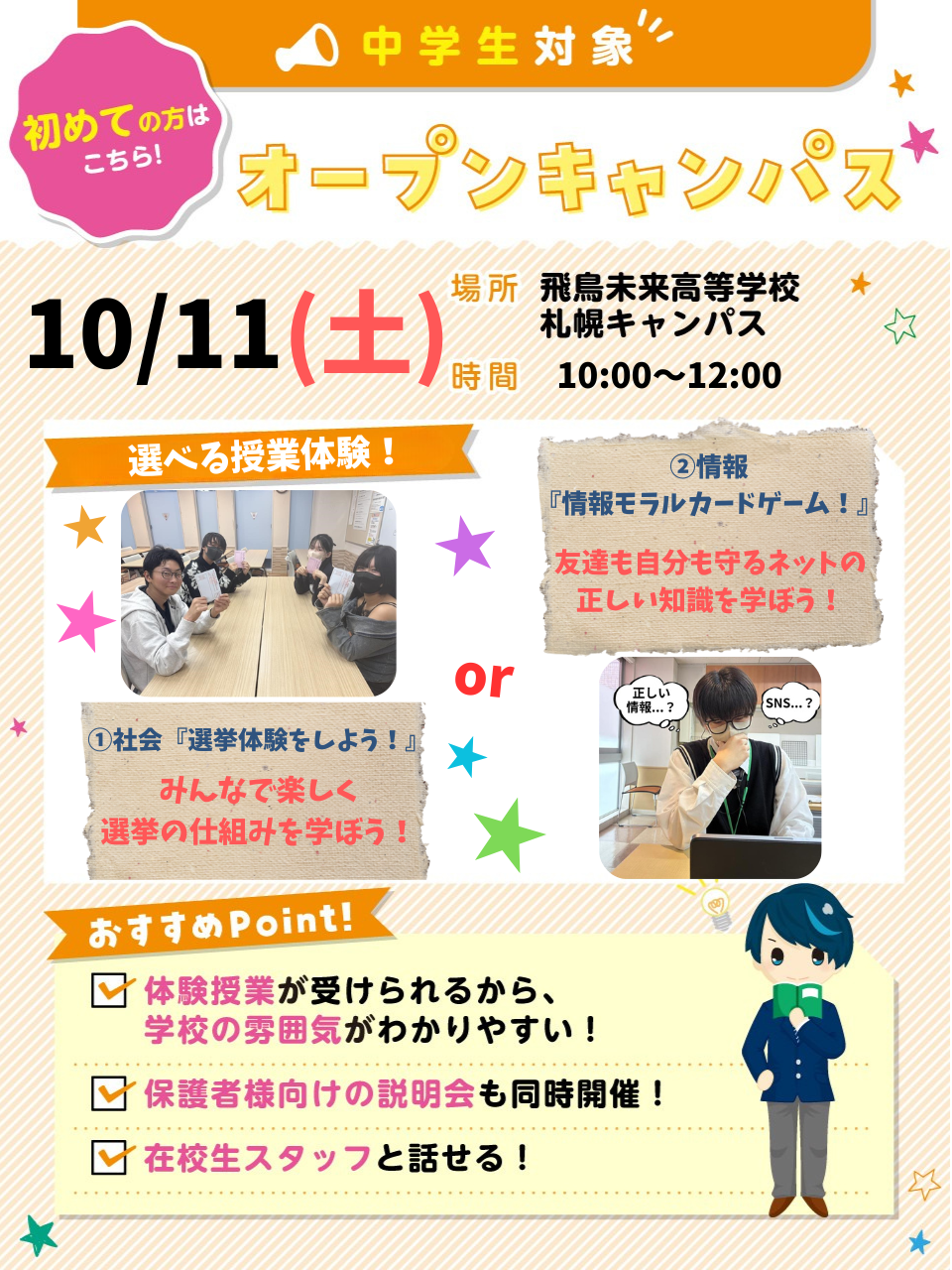 授業体験を通して、飛鳥未来高校の雰囲気や通い方がわかるオープンキャンパス!一人でも、保護者の方と一緒でも、お友達と参加でもOK!