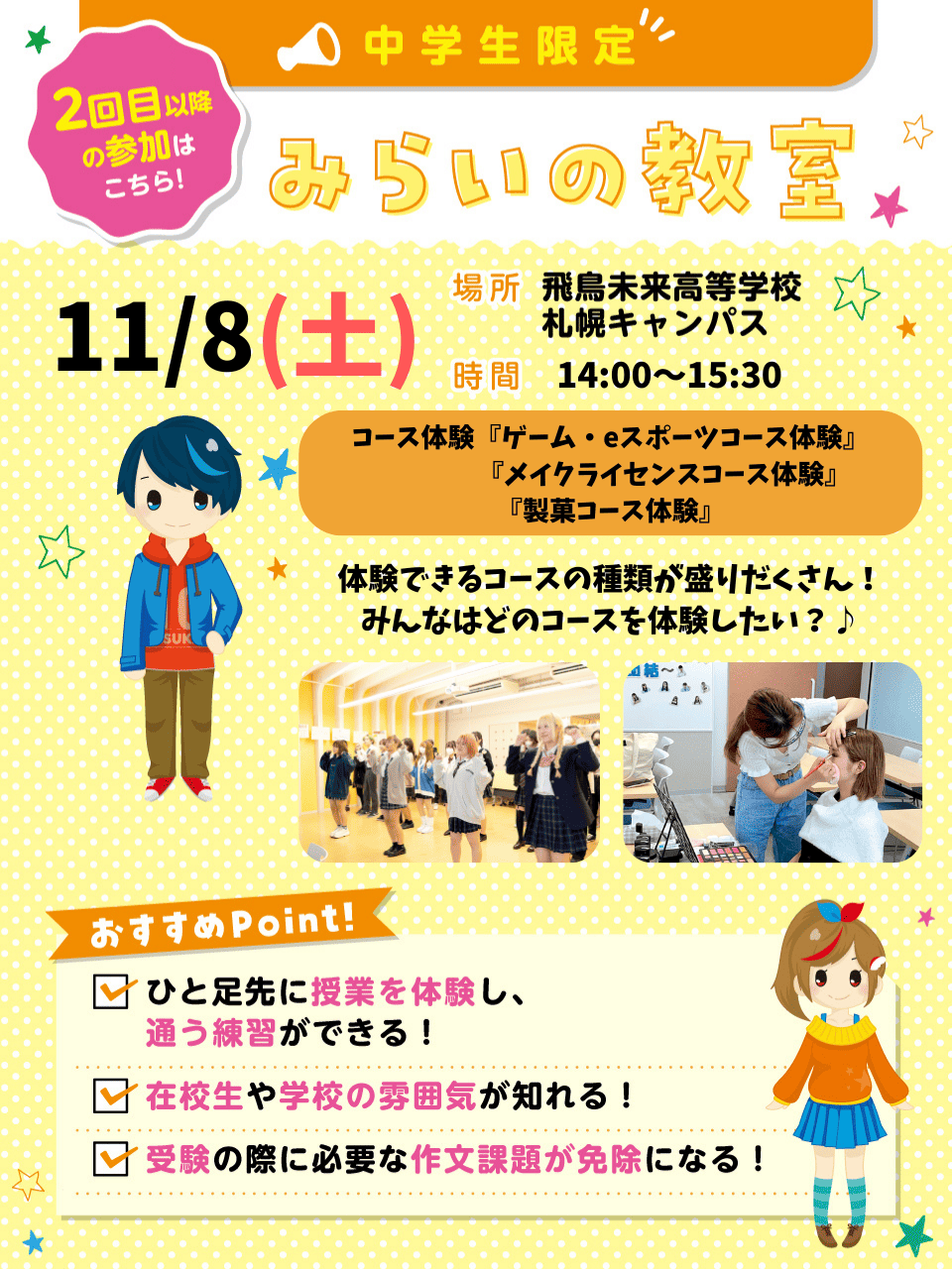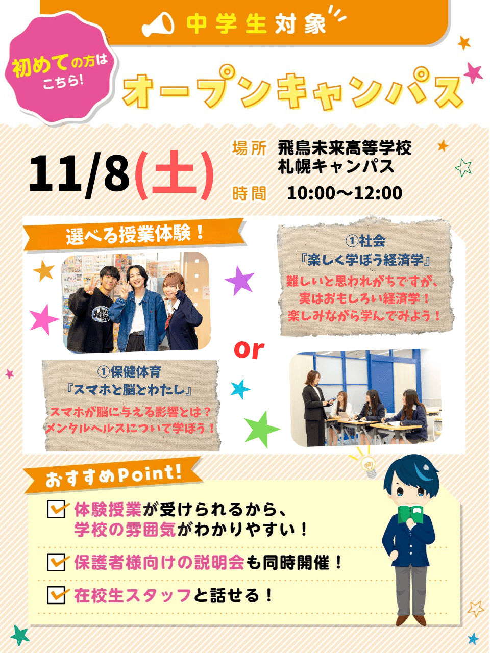授業体験は希望していないけど、飛鳥未来高校の話のみ聞きたい方には特におすすめ!一人でも、保護者の方と一緒でも、お友達と参加でもOK!