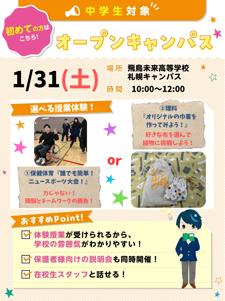 授業体験を通して、飛鳥未来高校の雰囲気や通い方がわかるオープンキャンパス!一人でも、保護者の方と一緒でも、お友達と参加でもOK!