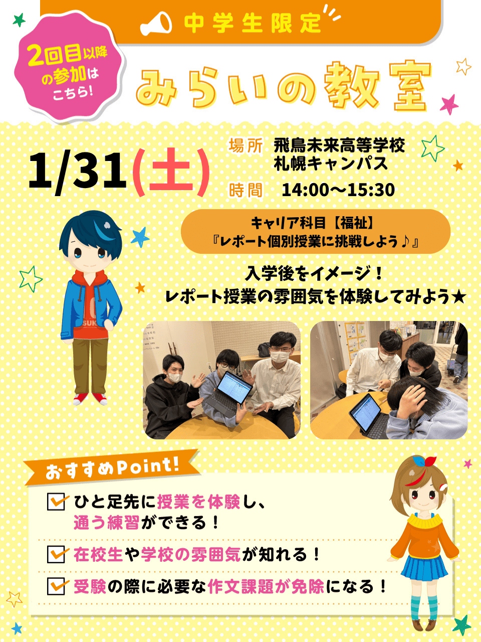 授業体験は希望していないけど、飛鳥未来高校の話のみ聞きたい方には特におすすめ!一人でも、保護者の方と一緒でも、お友達と参加でもOK!