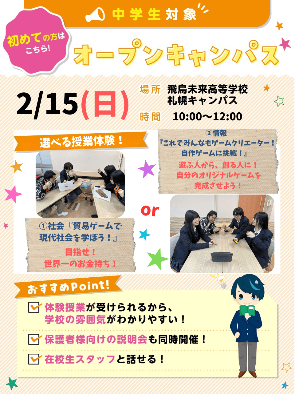 授業体験を通して、飛鳥未来高校の雰囲気や通い方がわかるオープンキャンパス!一人でも、保護者の方と一緒でも、お友達と参加でもOK!