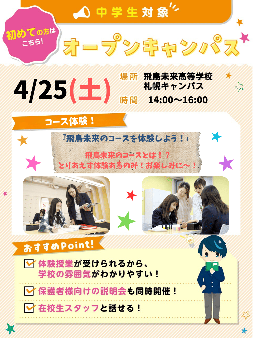 授業体験を通して、飛鳥未来高校の雰囲気や通い方がわかるオープンキャンパス!一人でも、保護者の方と一緒でも、お友達と参加でもOK!