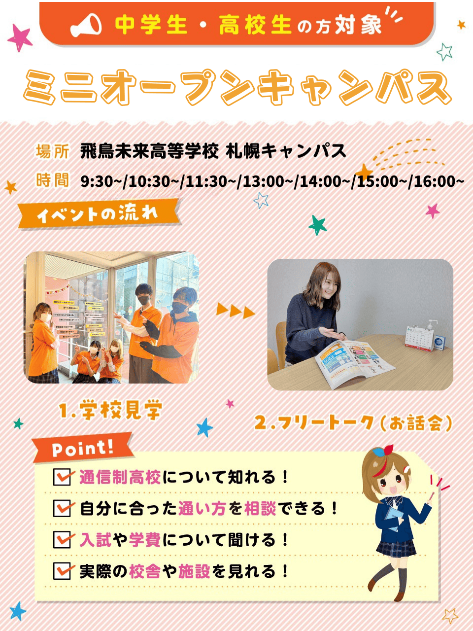 授業体験は希望していないけど、飛鳥未来高校の話のみ聞きたい方には特におすすめ!一人でも、保護者の方と一緒でも、お友達と参加でもOK!