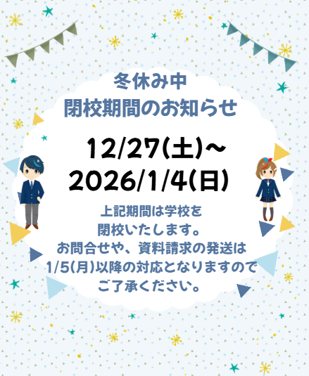 上記日程で学校を閉校いたします。皆さんも素敵な冬休みをお過ごしください!