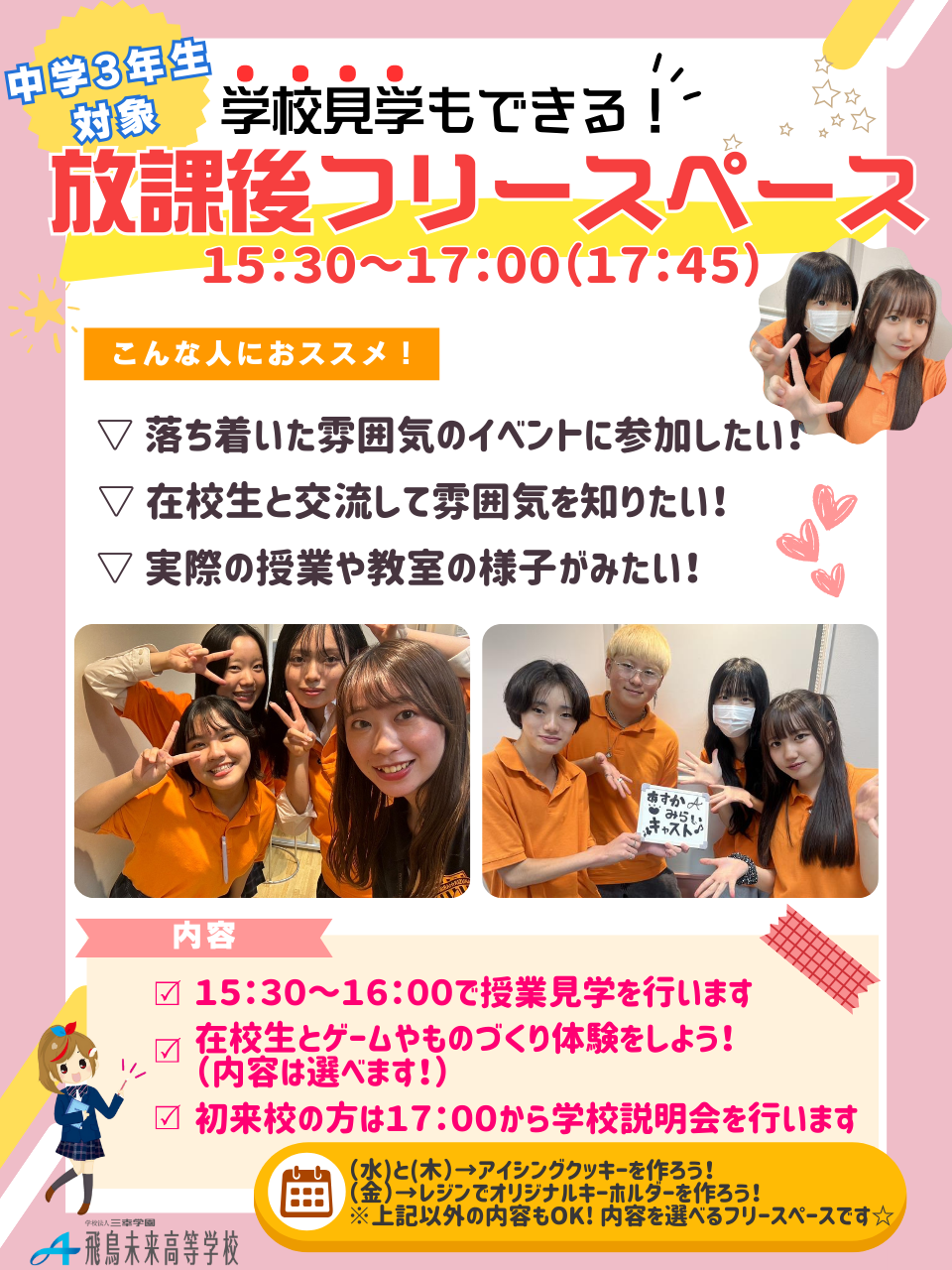 【中学3年生対象】10月17日(金) 学校見学&放課後フリースペース