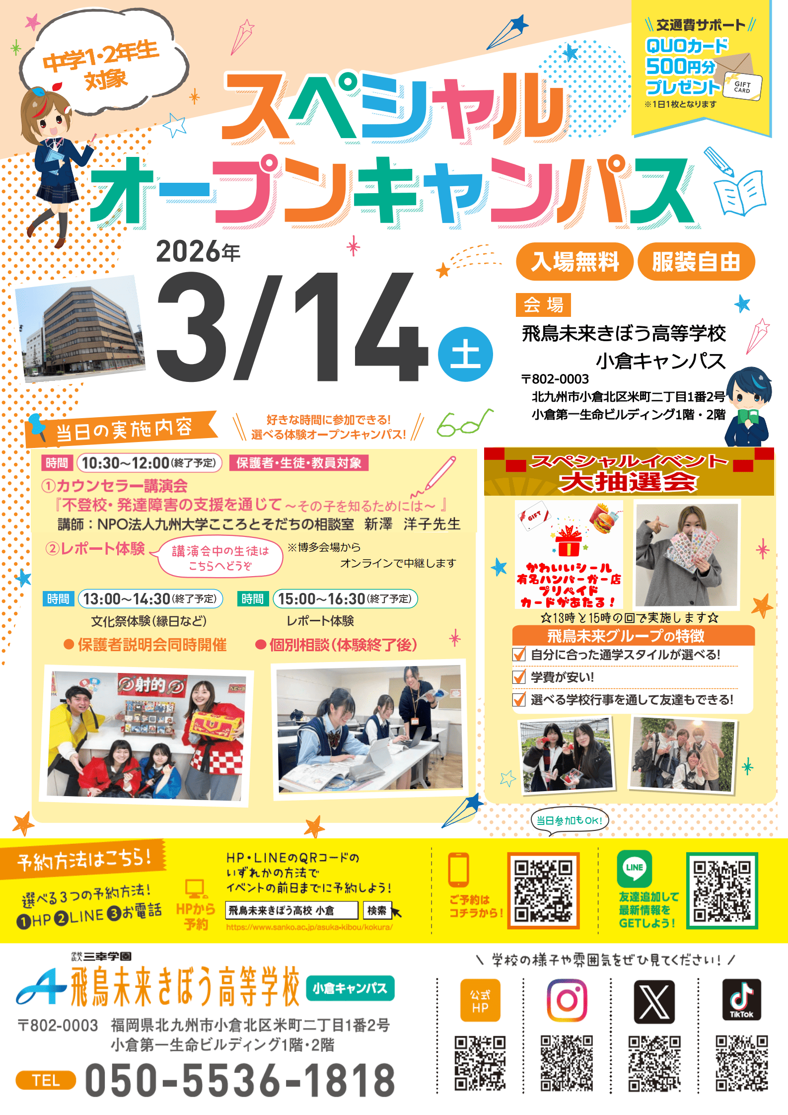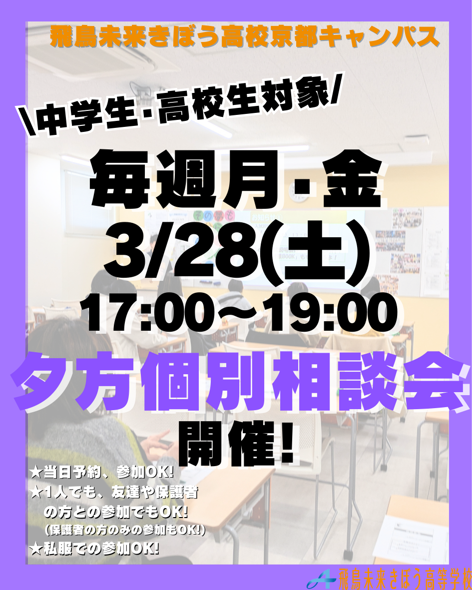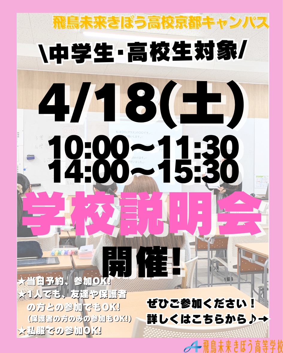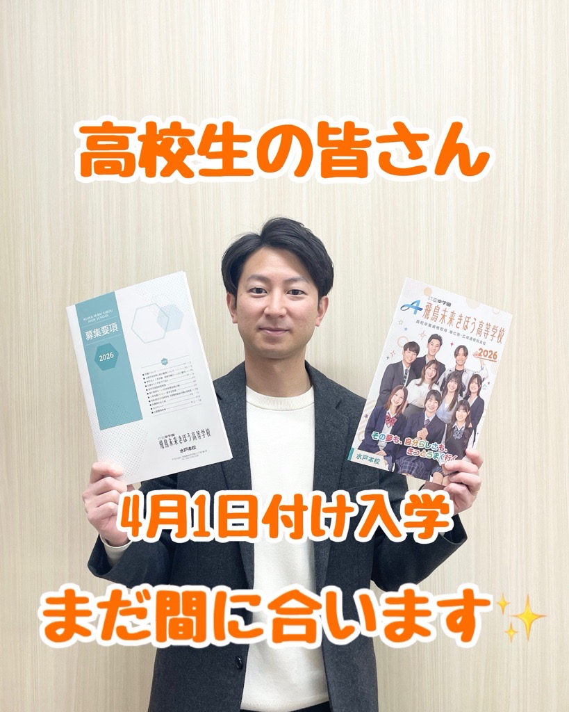 飛鳥未来きぼう高等学校は自分らしく、夢に向かって羽ばたく力を身につける事が出来る単位制・通信制の高校です。