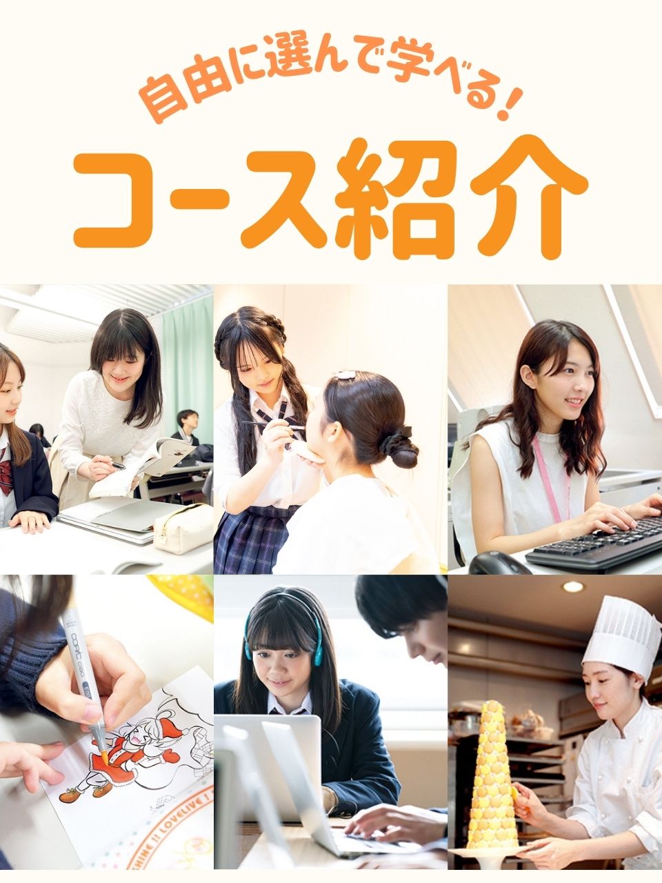 その他にも飛鳥未来きぼう高等学校には自由に選べるコースがあります。 進学コース・補習コース・メイクライセンスコース・ネイルライセンスコース・美容師免許取得コースなどプラスの学びが可能です。