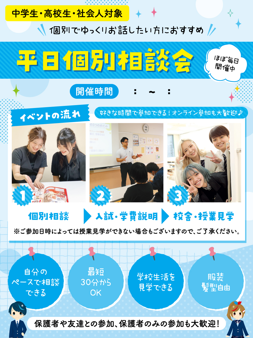 中学生の方、転入・編入希望の方大歓迎! 保護者の方のみのご参加もいただけます!