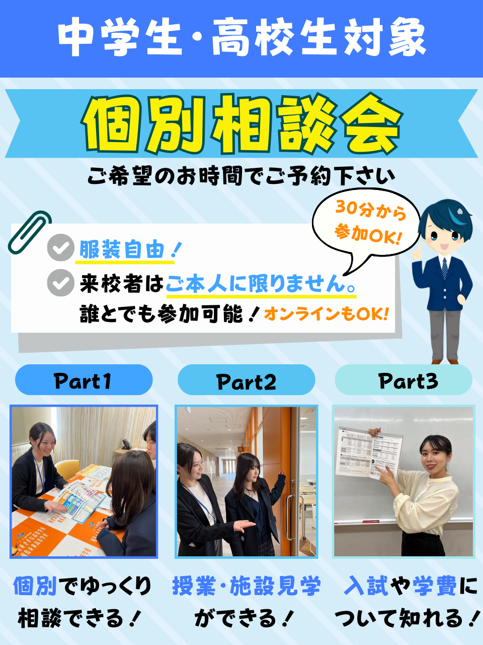 「勉強」「学校生活」「学費や入試」「卒業後の進路」「卒業時期」など、気になることや不安なことを解消できます☺