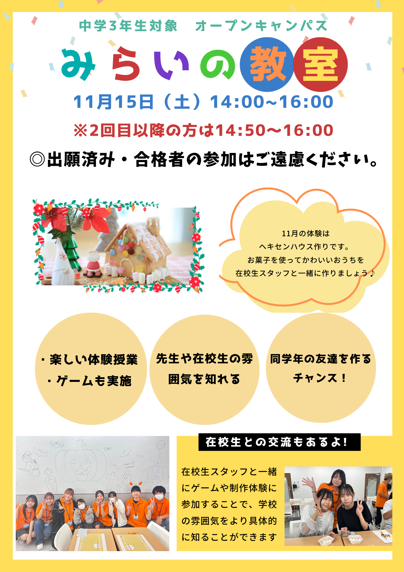 中学3年生対象にみらいの教室(オープンキャンパス)を以下の日程で開催しています!
