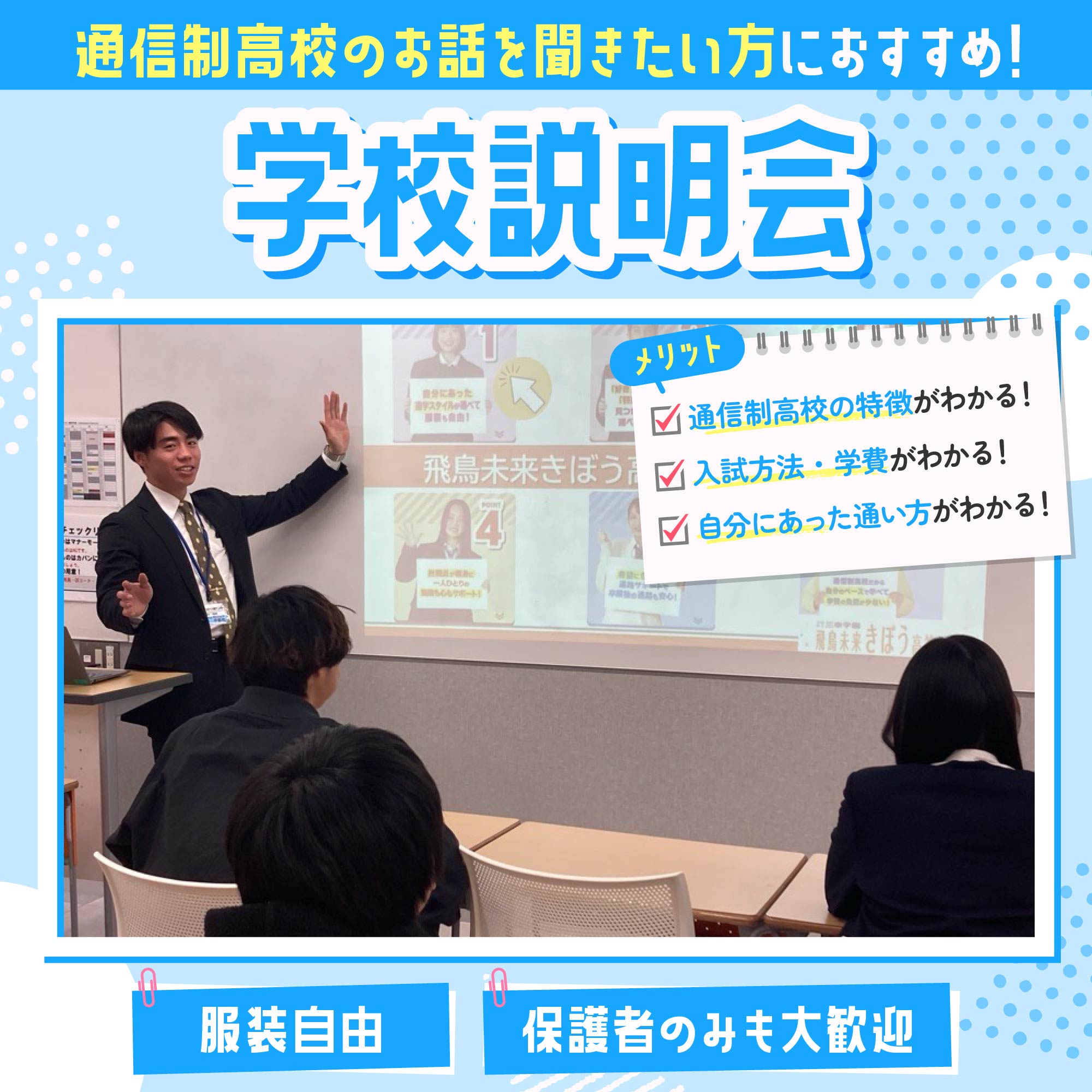 - 通学方法や学校生活、入試方法、学費について詳しく説明します。