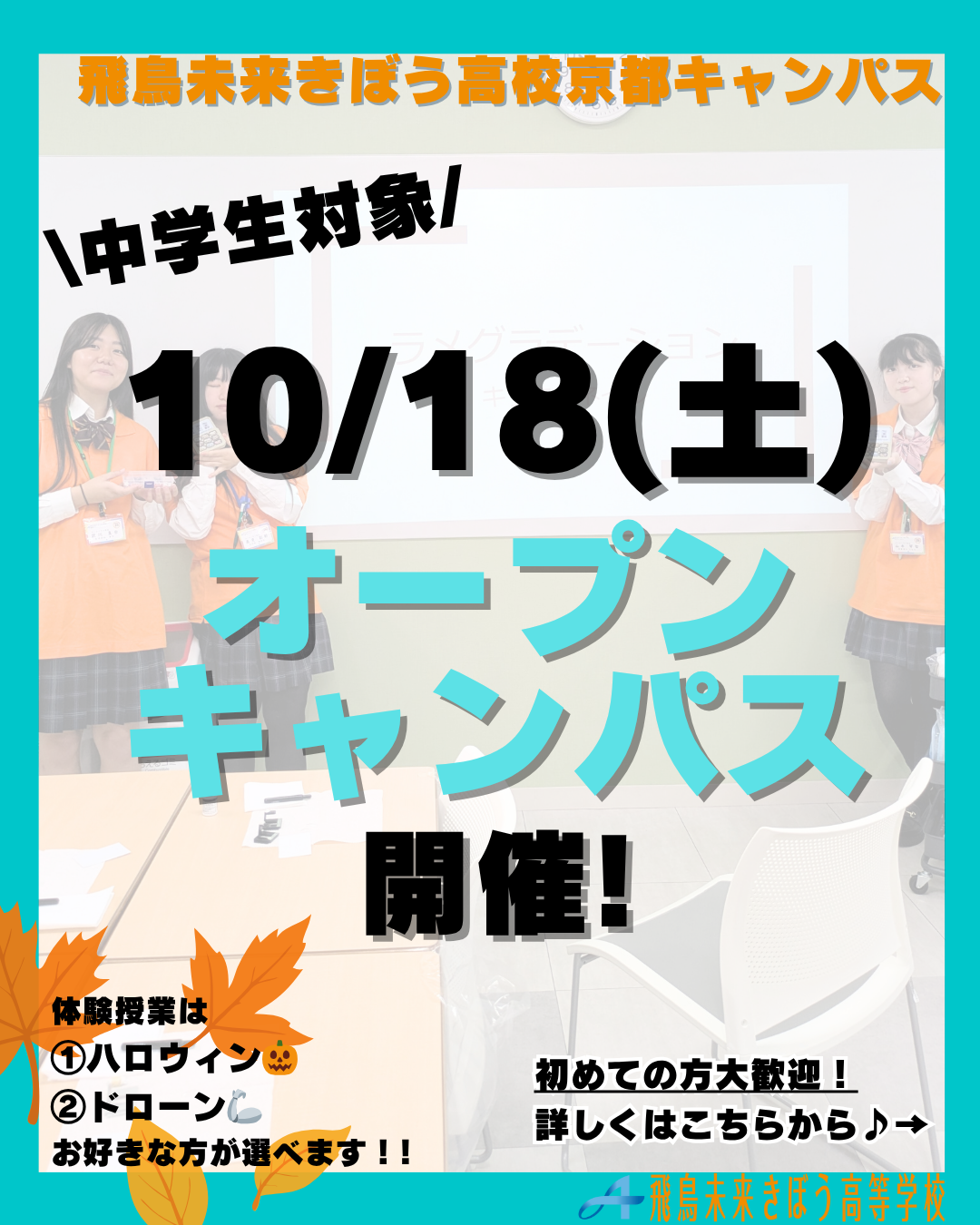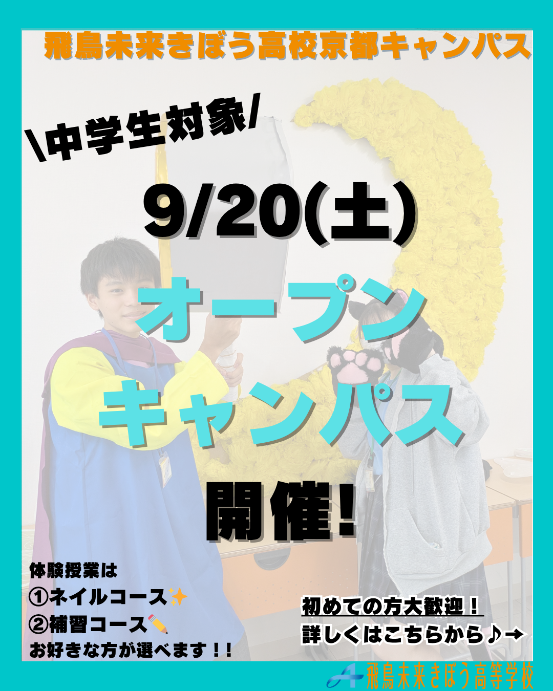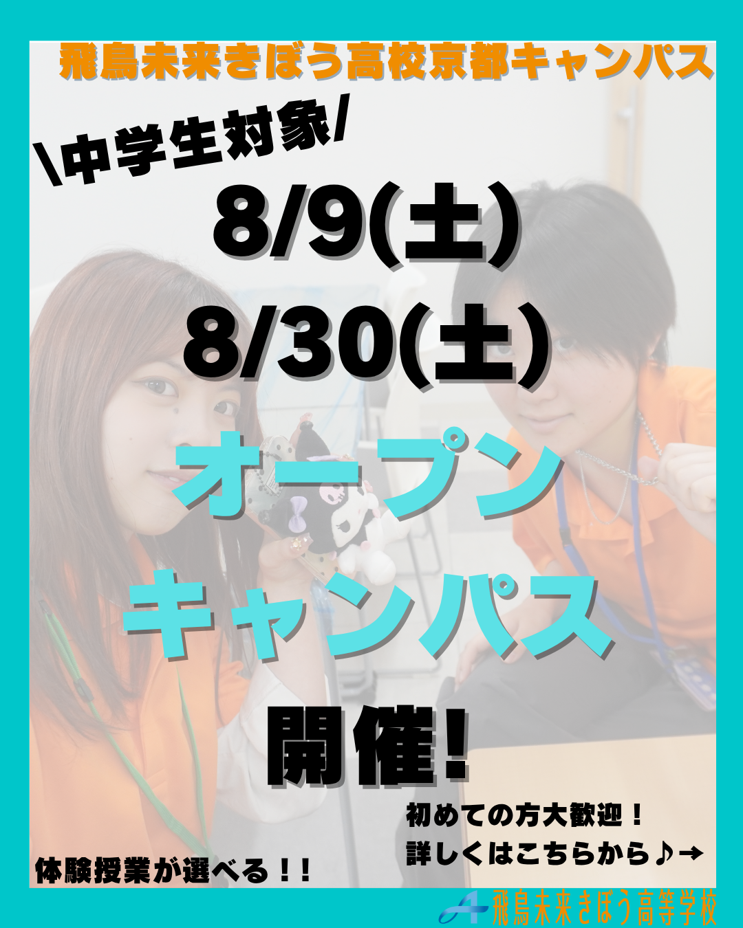 飛鳥未来きぼう高等学校(京都キャンパス)は自分らしく、夢に向かって羽ばたく力を身につける事が出来る単位制・通信制の高校です。