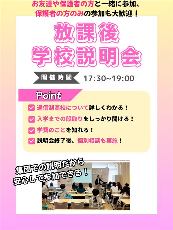 放課後学校説明会なので、学校帰りに友達と一緒に説明を聞きに行けます!もちろん本人のみや、保護者様だけでも大丈夫です!また集団説明会の形式なので個別だとちょっと・・・という方も安心して話を聞くことができます!!