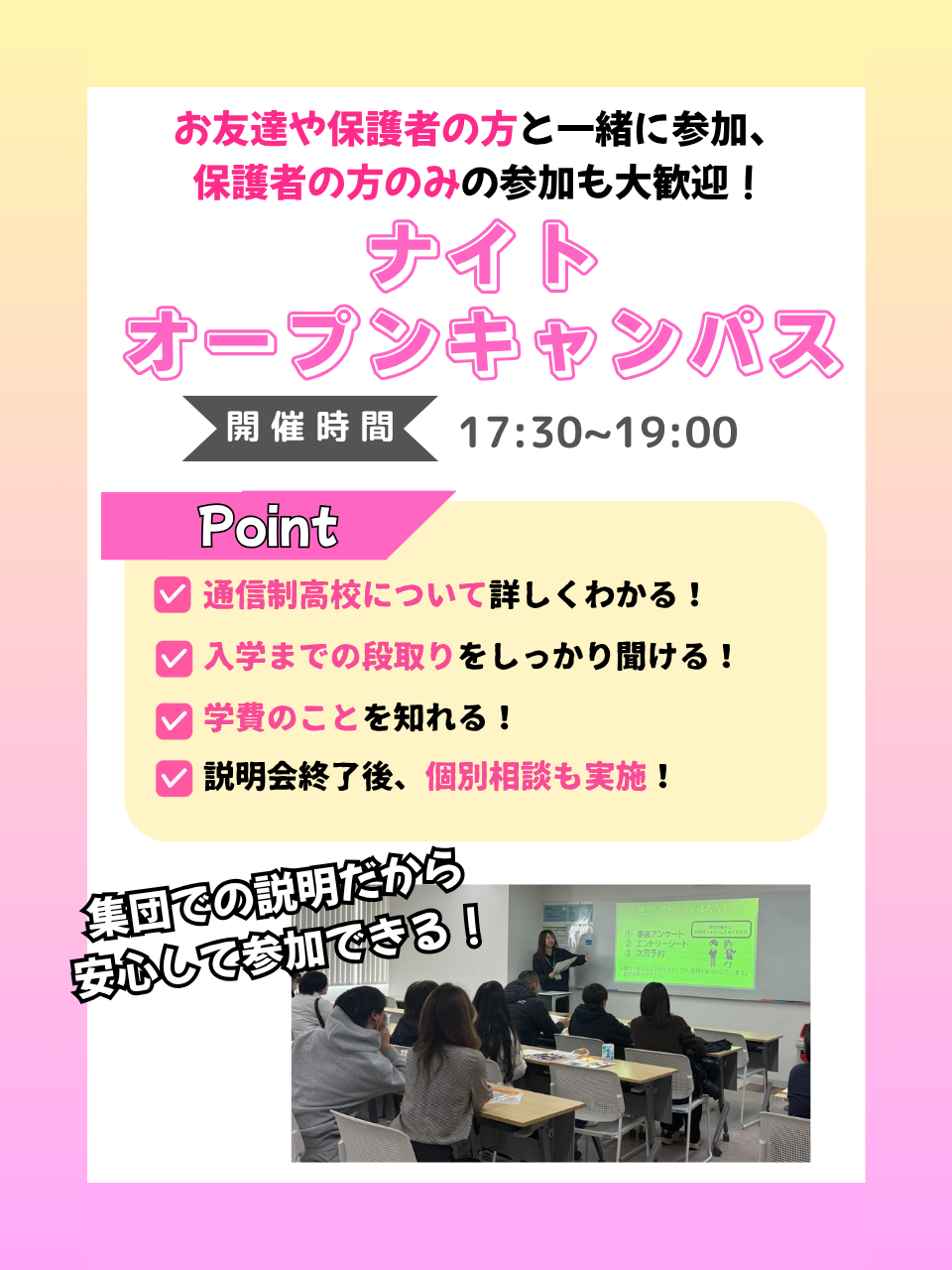 放課後学校説明会なので、学校帰りに友達と一緒に説明を聞きに行けます!もちろん本人のみや、保護者様だけでも大丈夫です!また集団説明会の形式なので個別だとちょっと・・・という方も安心して話を聞くことができます!!