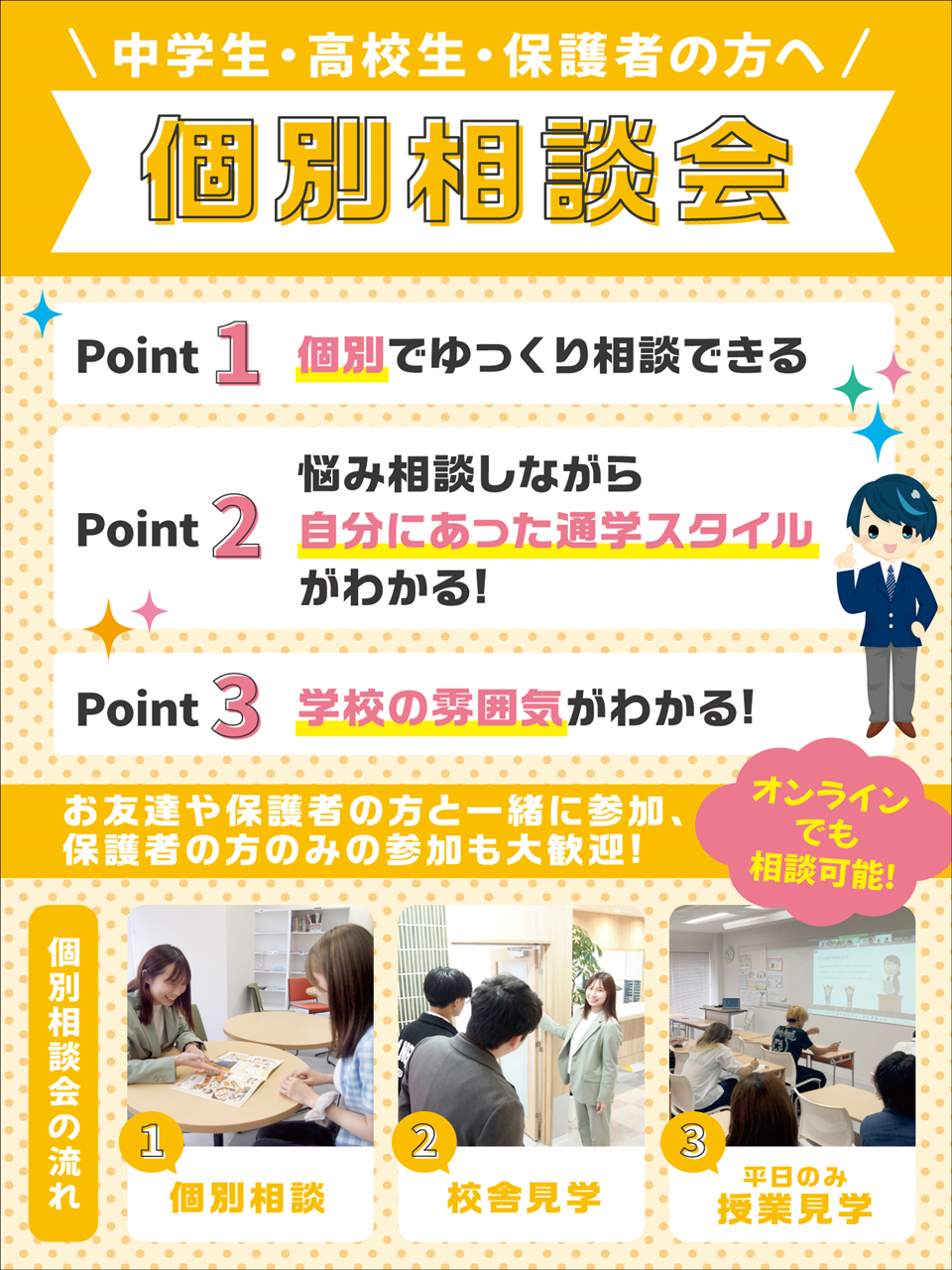 全学年対象、平日個別相談会を開催します!(高校を退学している方も大歓迎☆)