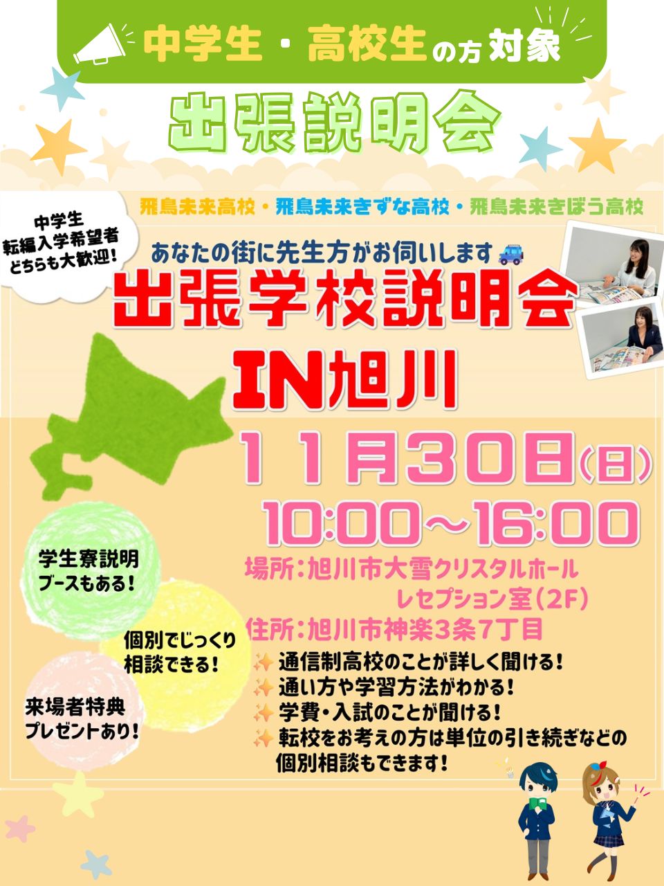 【中学生・転編入学希望者対象】11月30日(日)出張学校説明会(旭川)