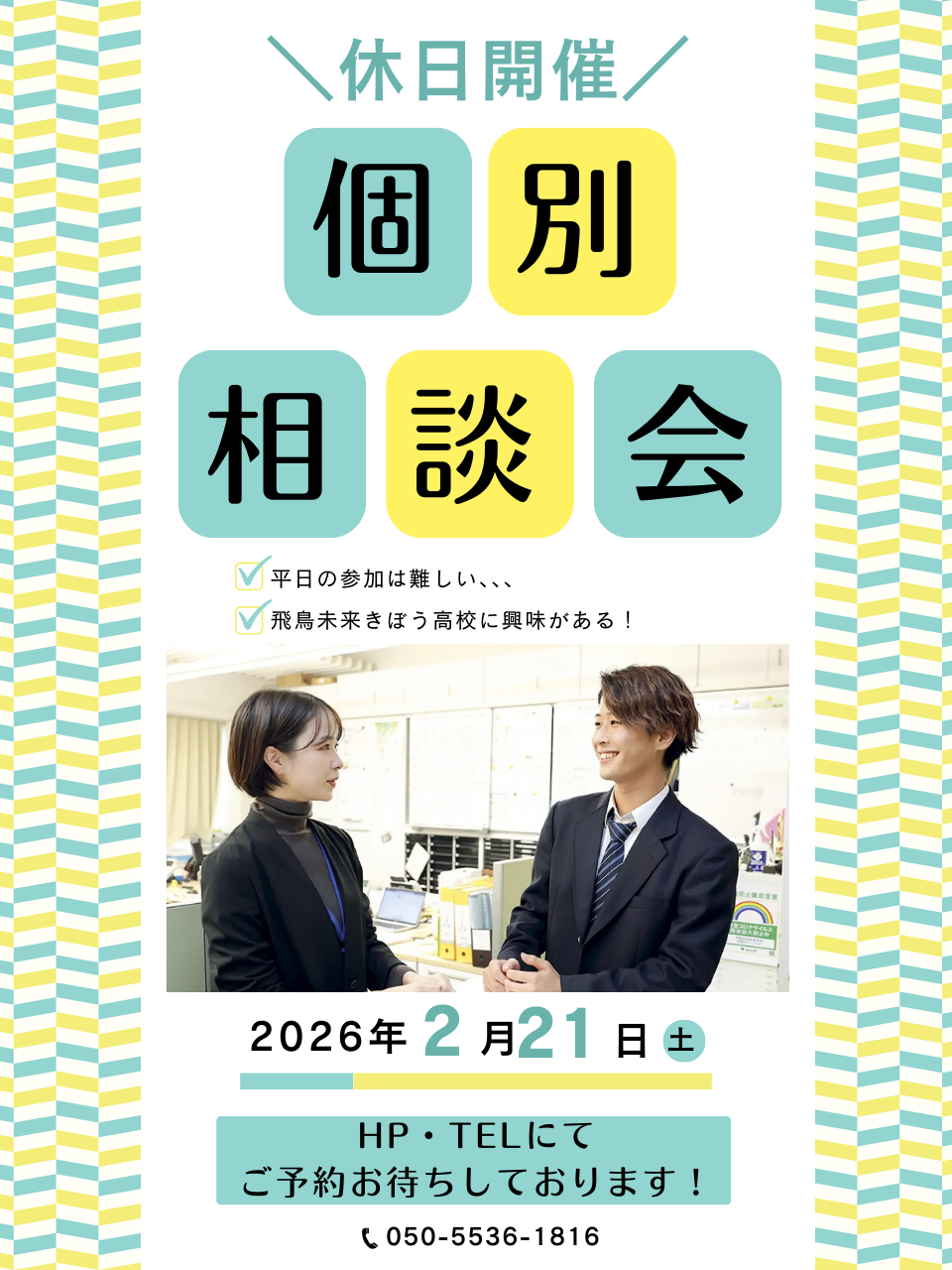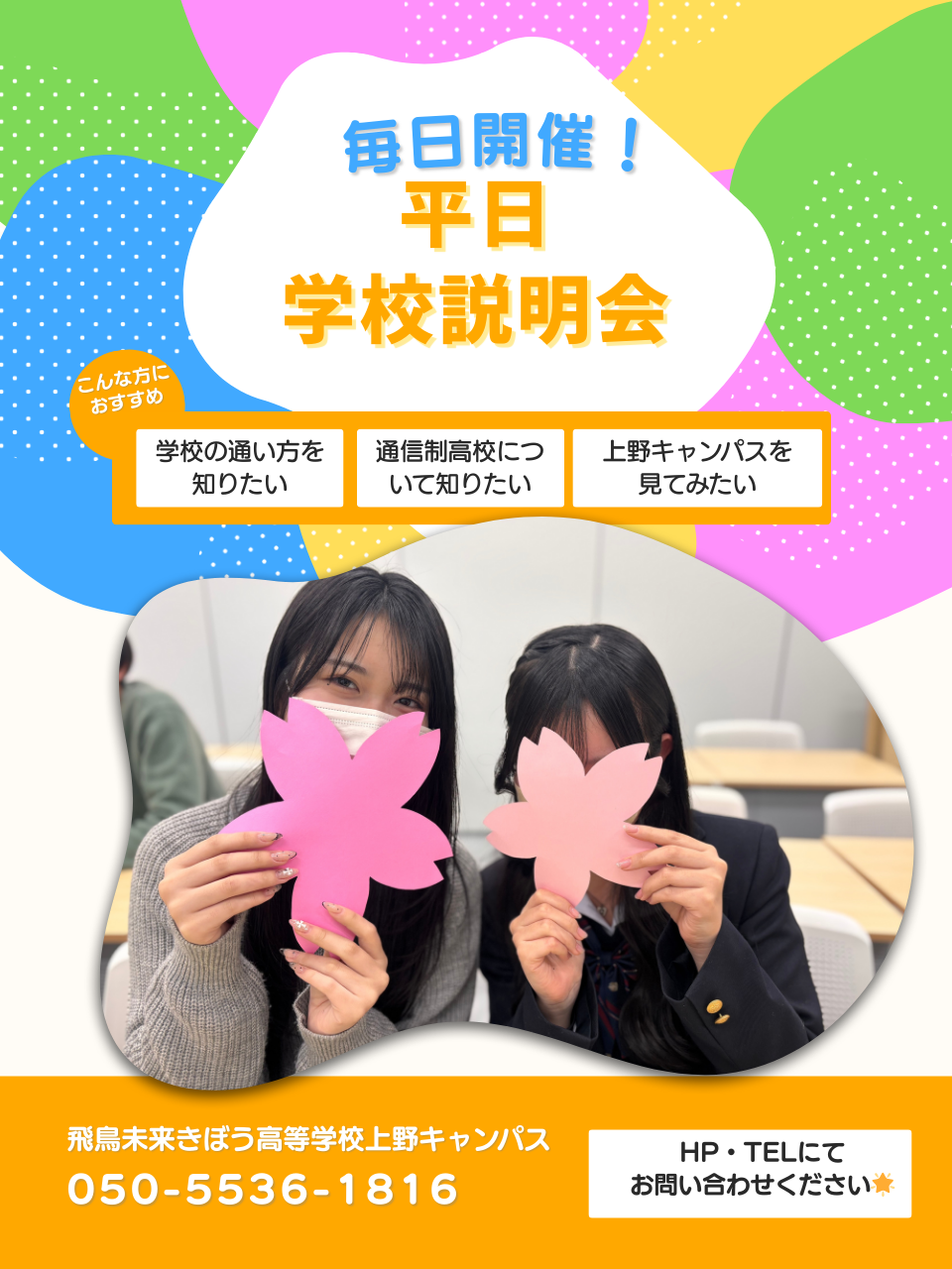 飛鳥未来きぼう高等学校(上野キャンパス)は自分らしく、夢に向かって羽ばたく力を身につける事が出来る単位制・通信制の高校です。