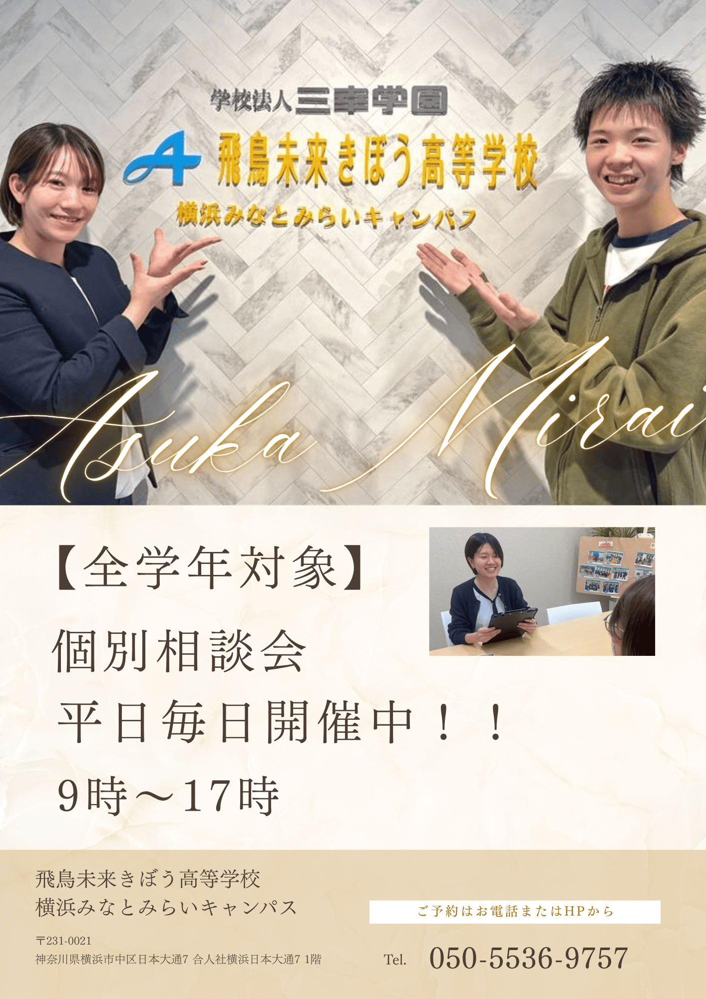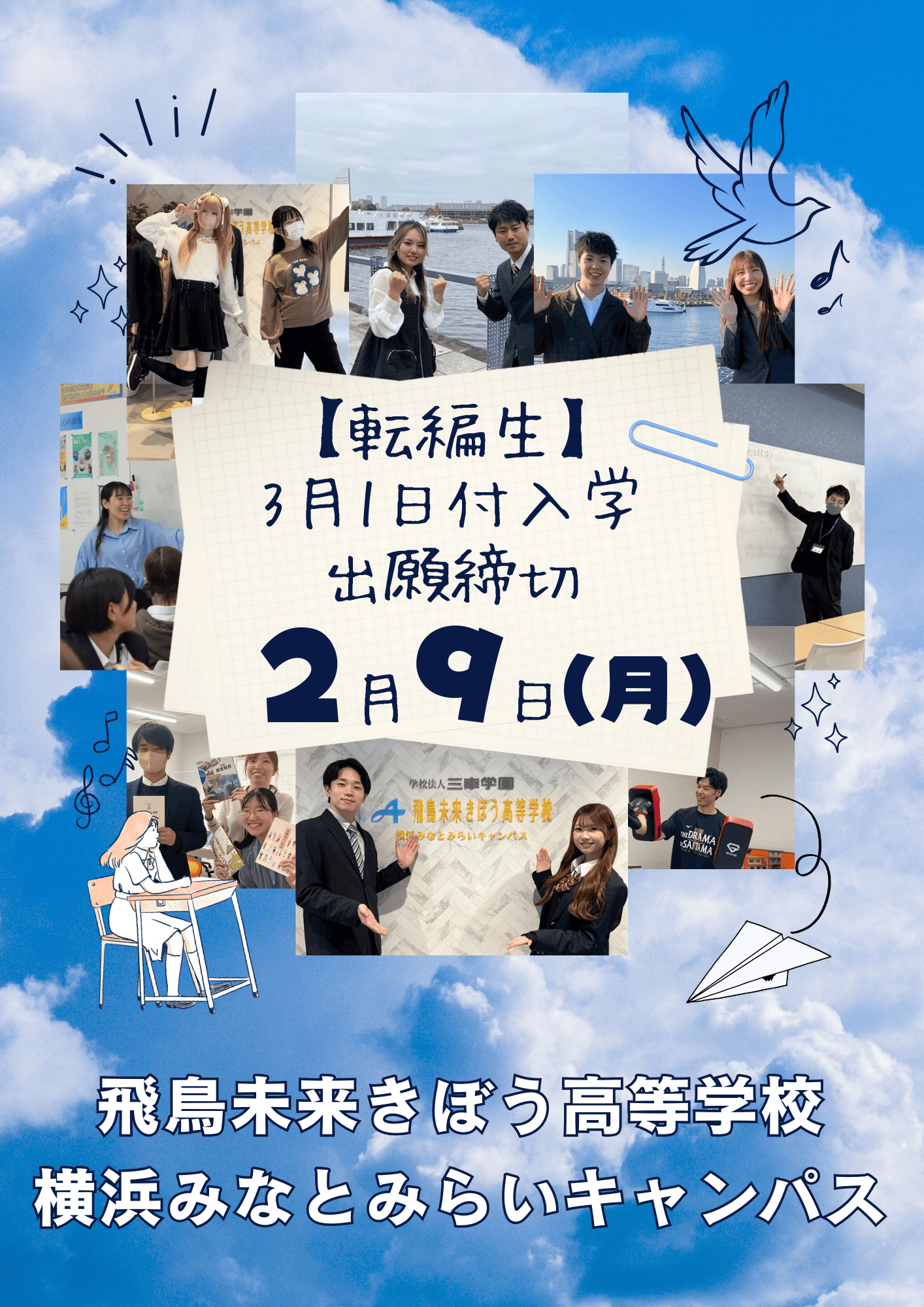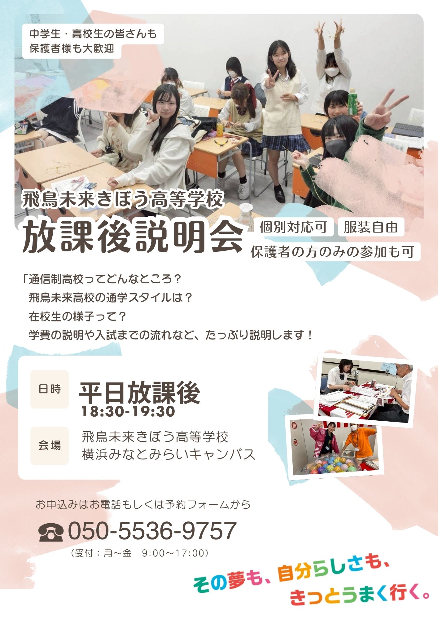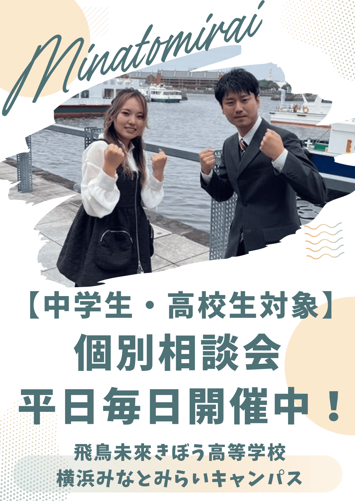 飛鳥未来きぼう高等学校(横浜みなとみらいキャンパス)は自分らしく、夢に向かって羽ばたく力を身につける事が出来る単位制・通信制の高校です。
