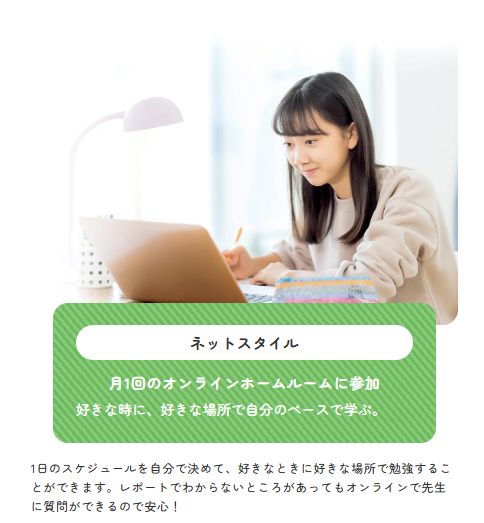 オンライン上で授業を受けることができるスタイルです。ホームルームは月1回オンラインで実施されます。ベーシック同様に出る行事を選ぶことができます!登校頻度を減らしたい人におすすめです!