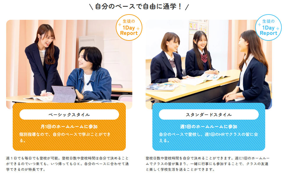 自分のペースで通学頻度を選んで卒業を目指す点はベーシックスタイルと同じですが、必須参加のホームルームが週1回実施されます。また、文化祭・体育祭への参加も必須です。勉強は自分のペースで、行事はクラスの皆と楽しみたい人におすすめです!