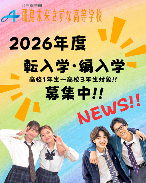 飛鳥未来きずな高等学校は自分らしく、夢に向かって羽ばたく力を身につける事が出来る単位制・通信制の高校です。