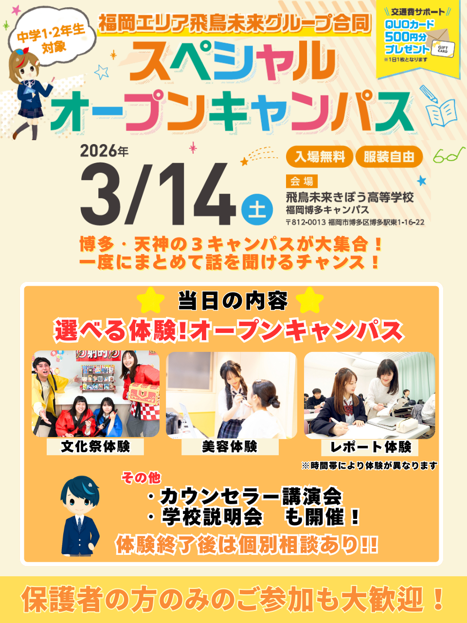 ※飛鳥未来きずな高等学校 福岡天神キャンパスでは開催していないのでご注意ください!