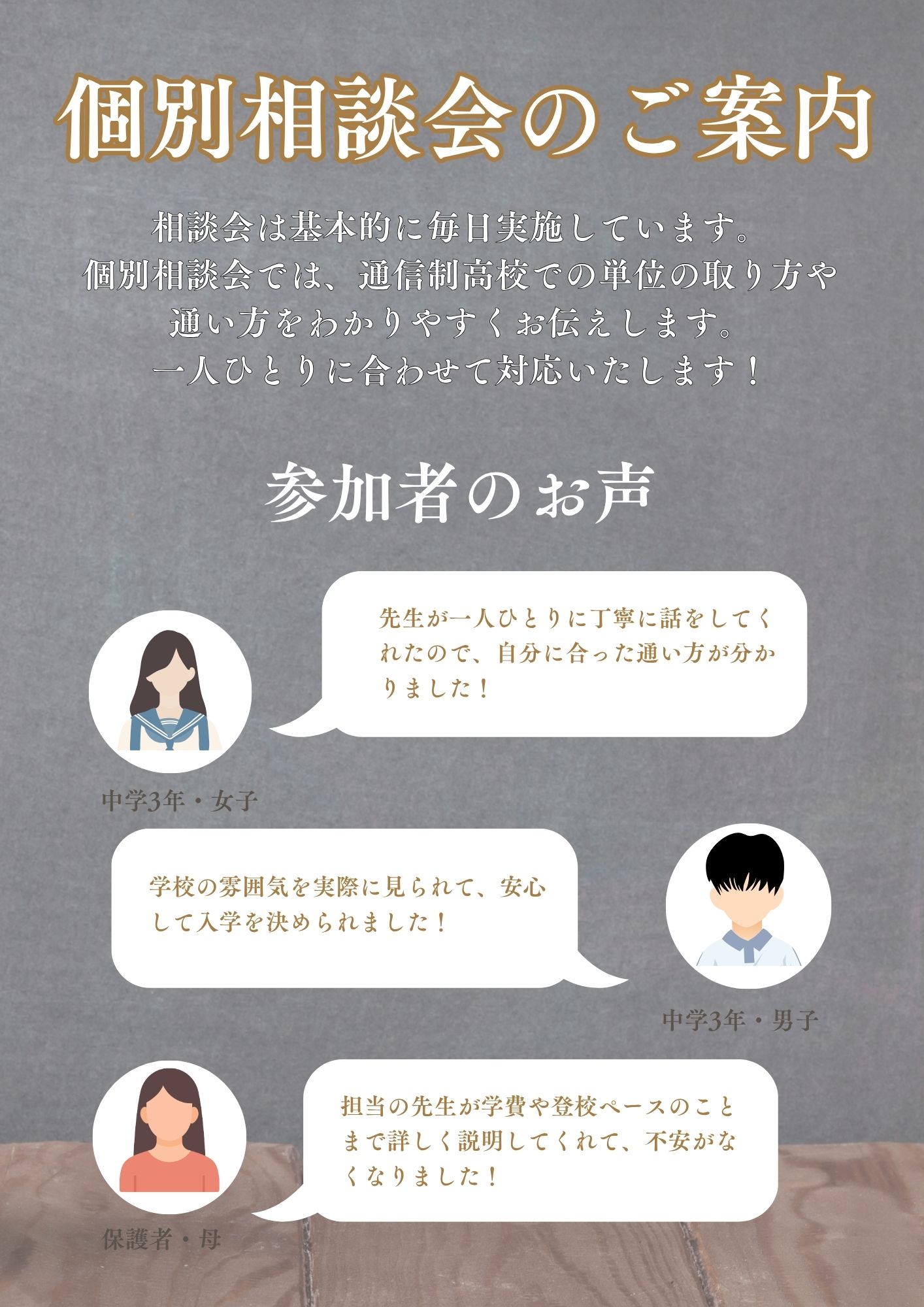個別相談会では、通信制高校での単位の取り方や通い方をわかりやすくお伝えします👌