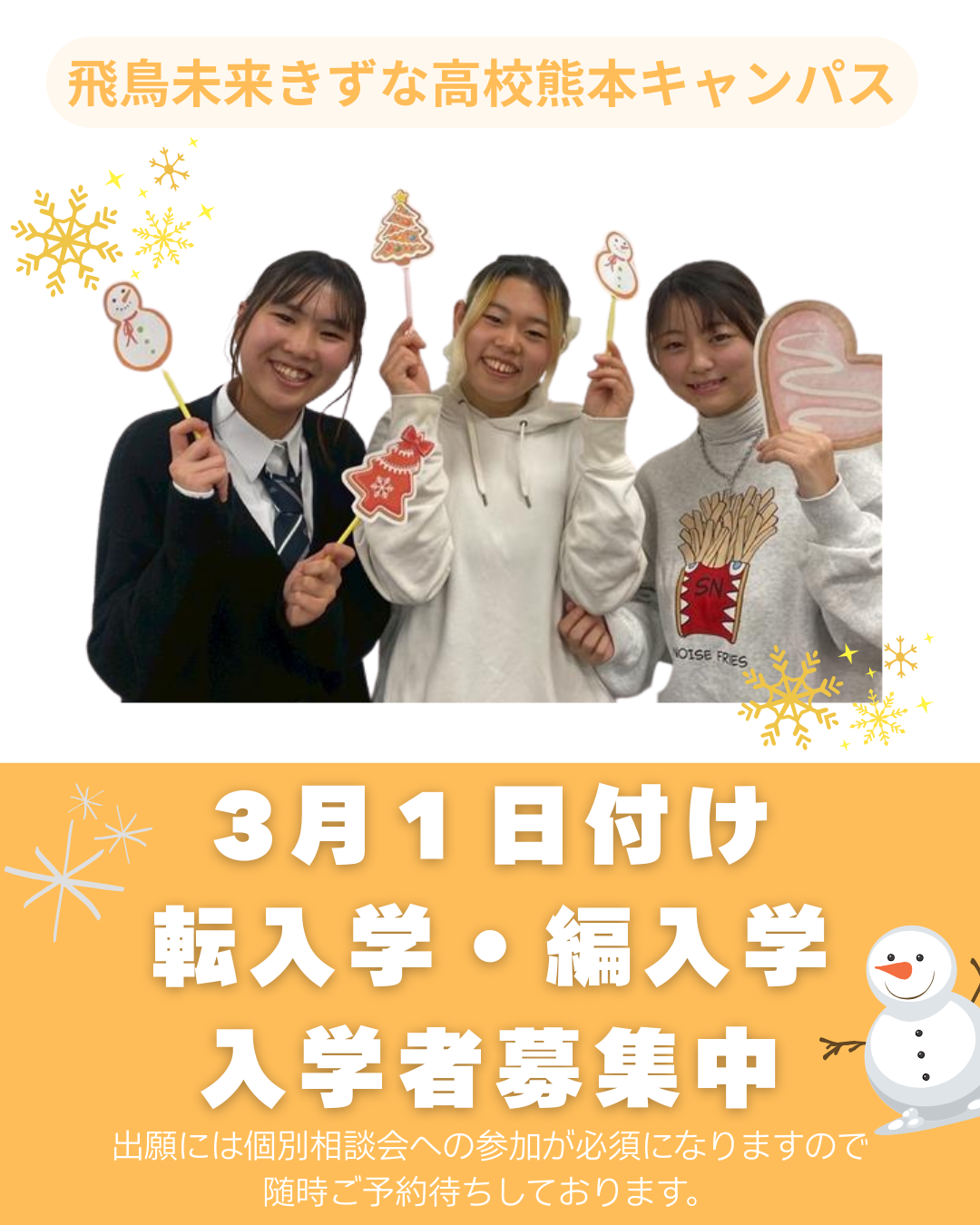 本校では【3月1日入学の転入学・編入学の生徒】を募集しております!!