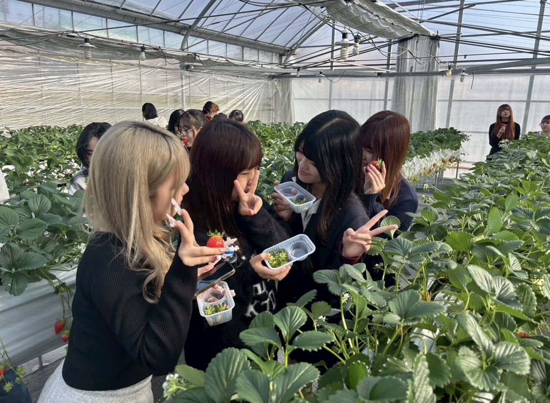 グループごとに分かれていちごを食べながら、
