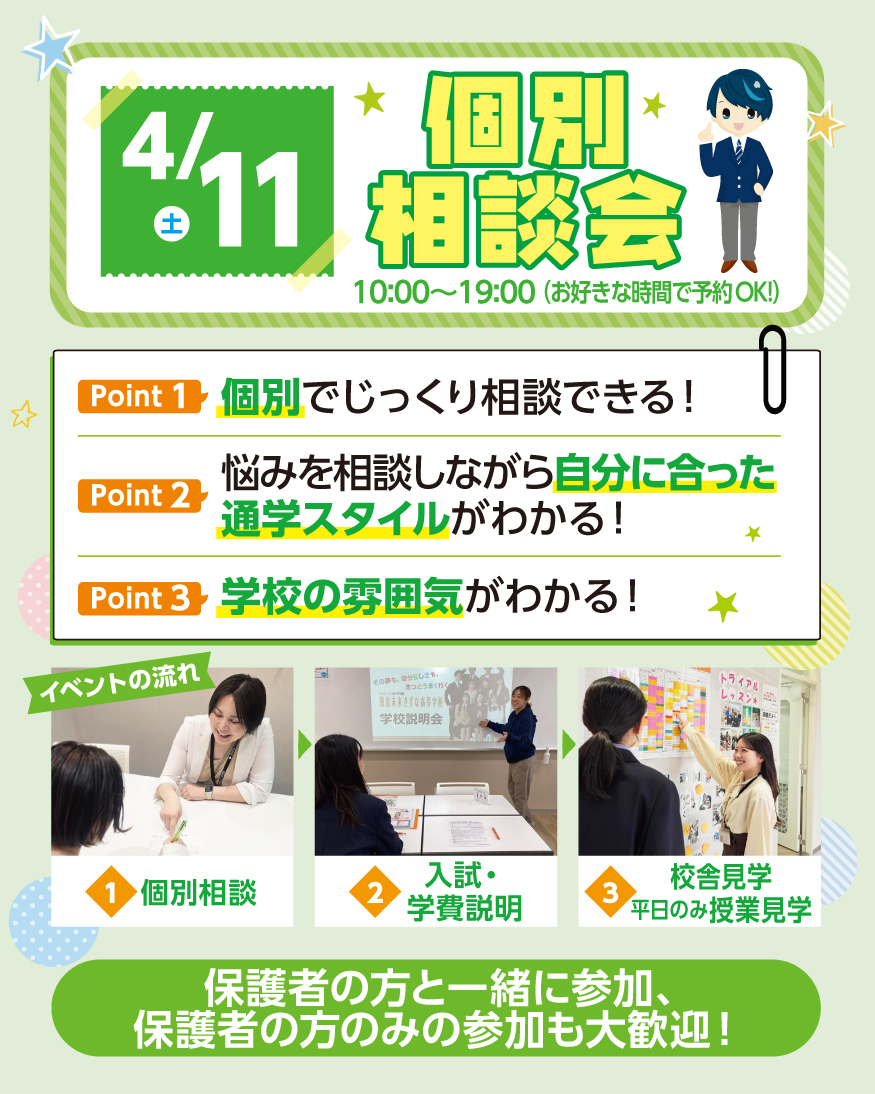 個別にじっくりお話を聞くことができます!中学生も高校生も参加可能なイベントです。
