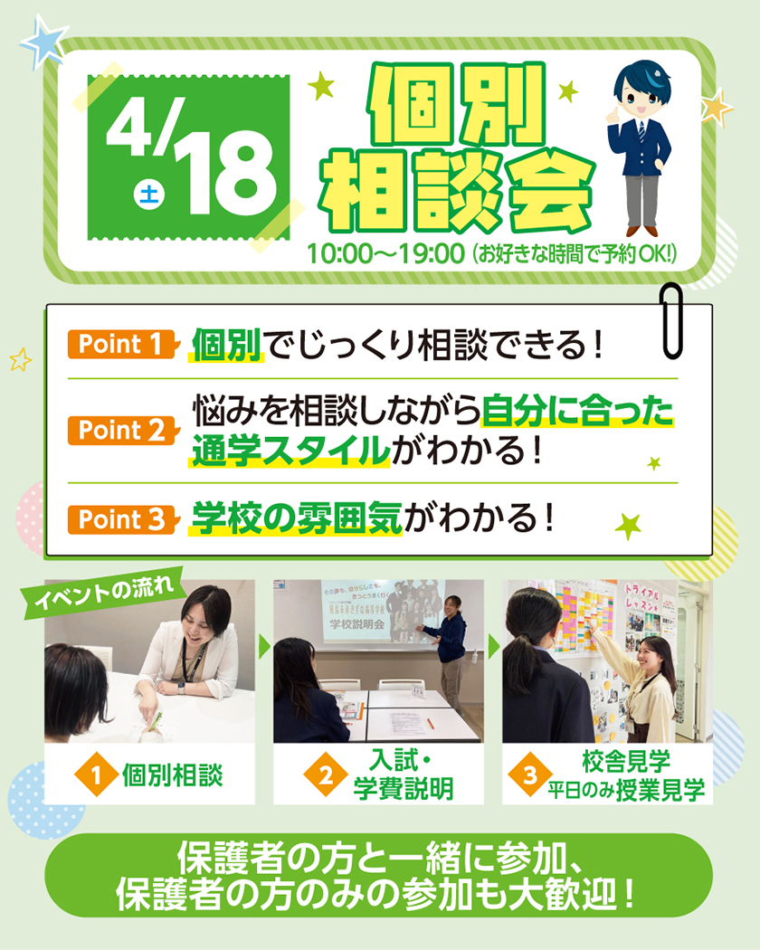 個別にじっくりお話を聞くことができます!中学生も高校生も参加可能なイベントです。