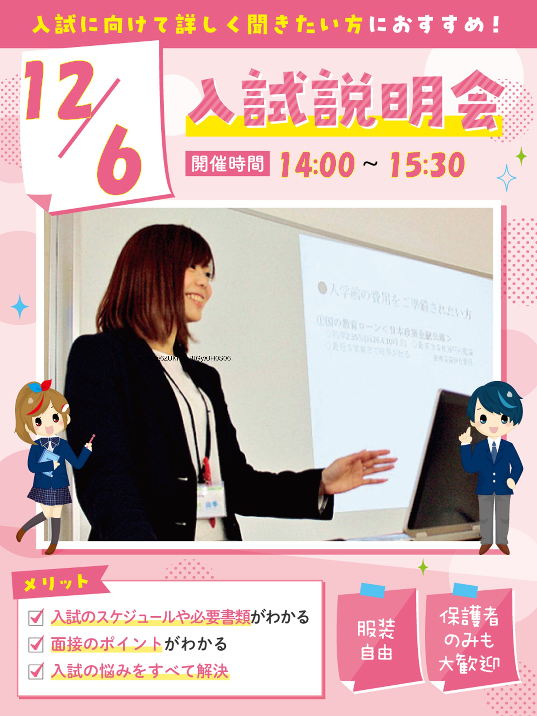 事前の個別相談会参加、もしくは当日10時からの学校説明会(要予約)に参加してから、
