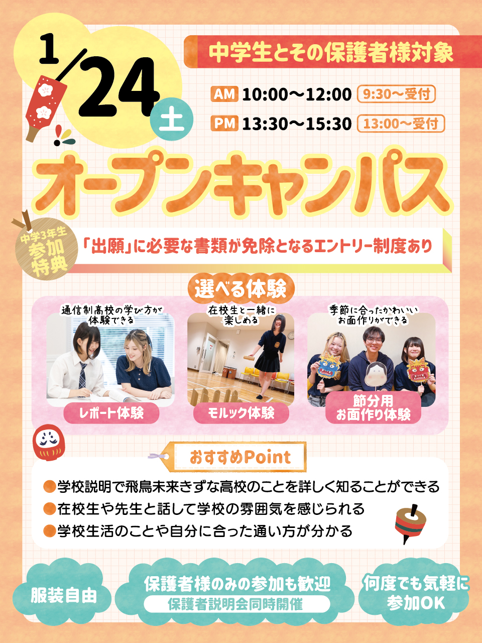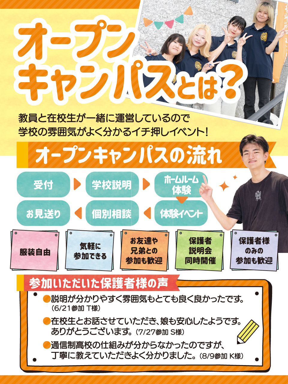 今回のオープンキャンパスは、中学1・2・3年生の皆さん全てが参加対象!!中学3年生の皆さん!まだ進路を決めきれていない方も間に合います!