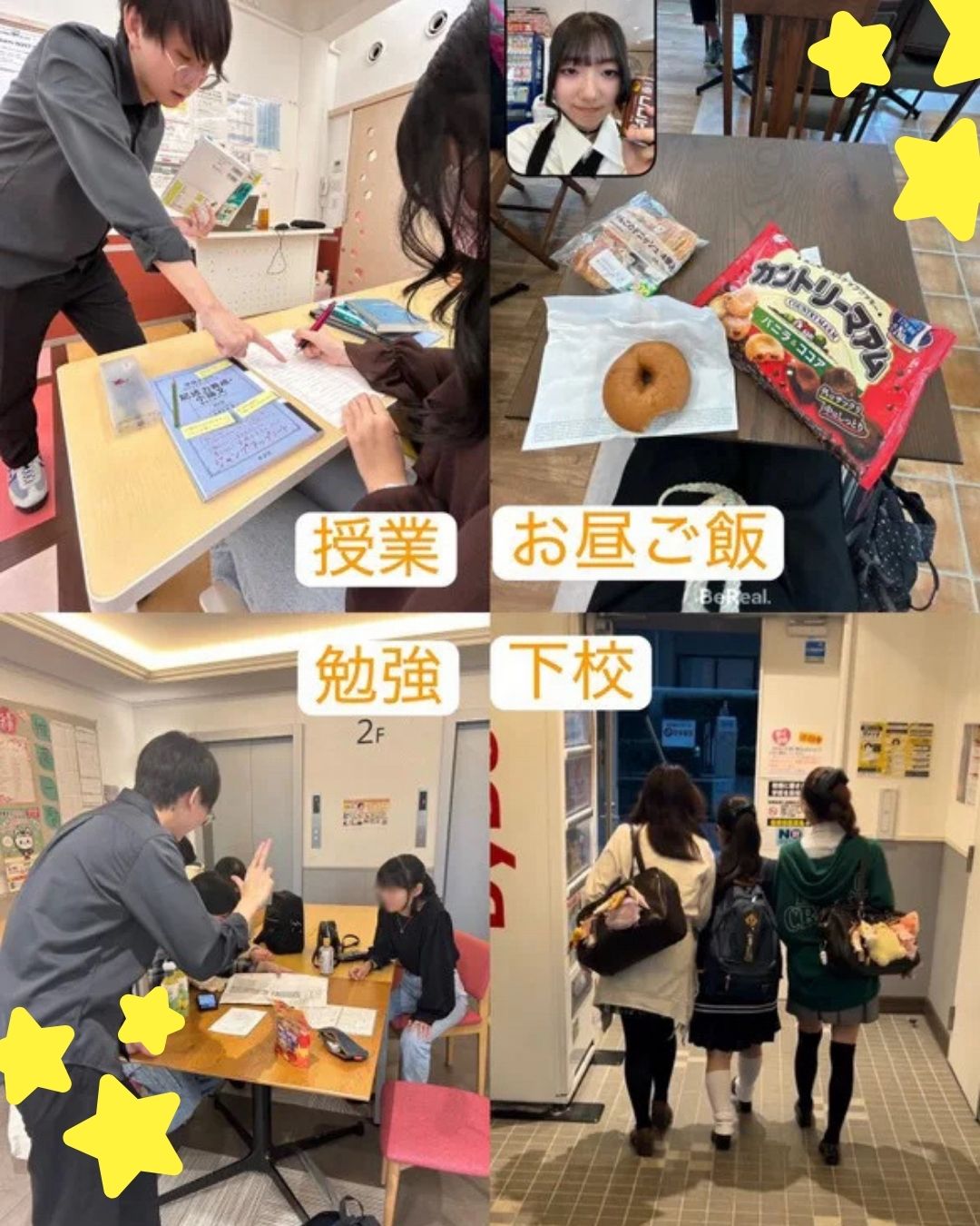 学校でお友達と合流し、一緒にゲームや音楽🎶アニメやドラマなどを楽しんだり、おしゃべりしながらお昼ごはん🍝をたべたり、おやつをたべたり…