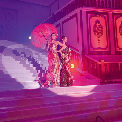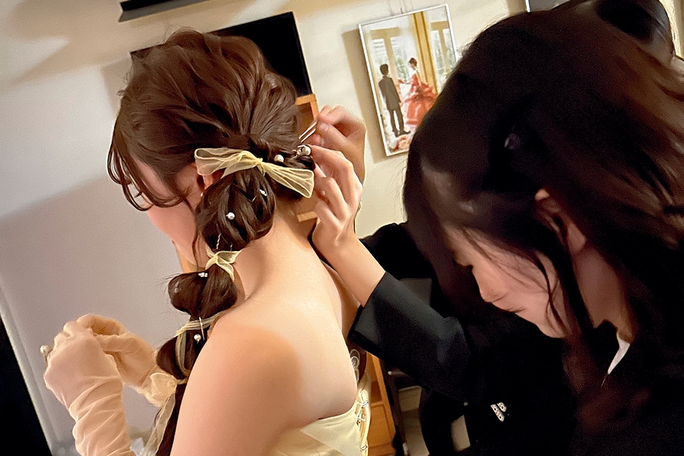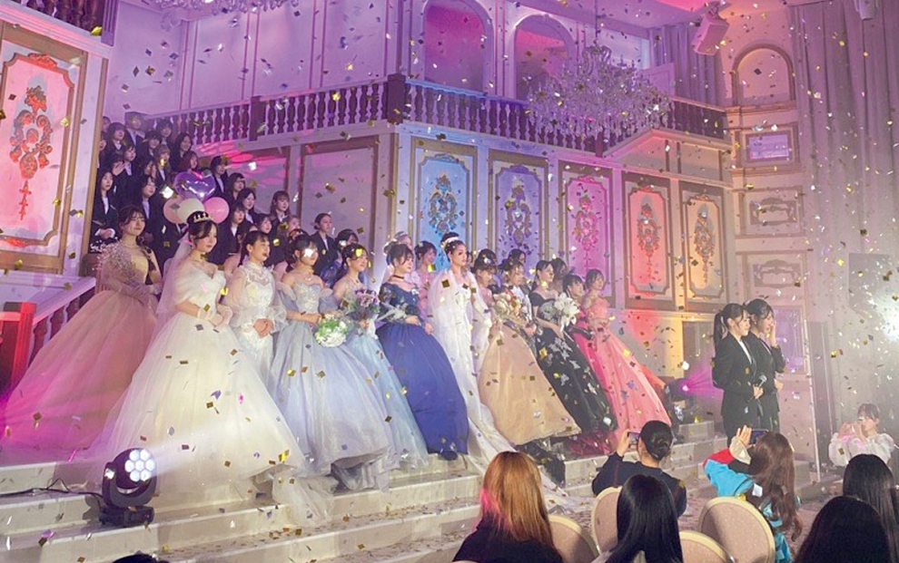 ブライダルヘアメイク&ドレス科の2年生がこれまでの学びの集大成を発表するイベントです。近隣のホテルなどを会場に、ドレスや着物のリメイク、ヘアメイク、ネイル、振り付け、プランニング、音響に至る全てを学生だけで行います!