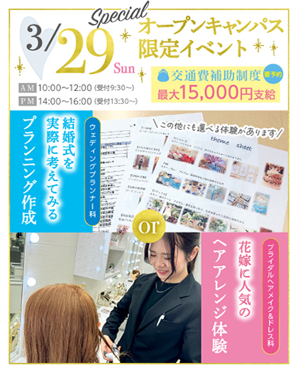 2026.03.16 【高校1・2・3年生/再進学者におすすめ】オープンキャンパスのご案内★2026年4月入学まだ間に合います!!3月は初めて来校する新高校3年生は交通費補助2倍!! オープンキャンパスのご案内♡ 1日で職業・学校・入試・学費のことが 知れますよ! 《保護者説明会同時開催》 《入試説明会同時開催》 ▼AM▼ 10:00~12:00(9:30受付開始) ▼PM▼ 14:00~16:00(13:30受付開始) ▼ナイト▼ 16:00~19:00(最終受付18:00) 16時以降は個別相談でのご案内になります! 予約ページは画像をタップしてね!