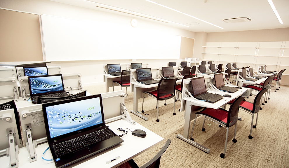 料飲サービスや披露宴演出を学べるパーティールームです。PCルームでは、就職先の情報を調べたり、就職に役立つPCスキルを身につけます。