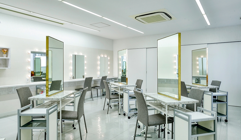 色とりどりのドレスやジュエリーが豊富にそろうドレス実習室。ドレスのフィッティングや着付けの授業などで使用します。サロン同様のメイク・ネイルルームで、メイクやヘアアレンジの技術を習得します。