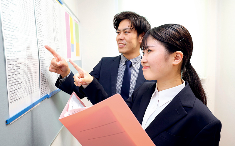 学生一人ひとりの個性や実力をしっかりと把握しているクラス担任と、就職したいエリアの情報に詳しいエリア担当教員の2人で、就職活動をガッチリとサポート。よりリアルで的確なアドバイスを行います。