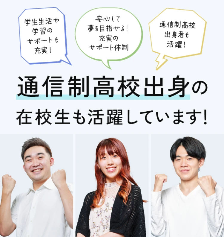 - 通信制高校からの進学に不安はありましたが、実際に入学すると、年齢差があっても受け入れてくれそうな先生方の雰囲気に安心しました。担任制でありながら、担任以外の先生とも話せる環境が整っており、相談しやすい点が魅力です。授業の少ない日はアルバイトや趣味の時間にあて、充実した毎日を過ごしています。進路選びでは自分がやりたいことに向き合い、学ぶ意欲を保てる学校を選ぶことが大切です!