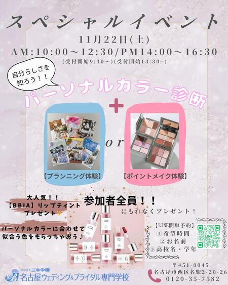 2025.10.22 【高校1・2年生必見✨】11月のスペシャルイベント! 11月スペシャルイベント マイスタイルウェディング✨ パーソナルカラー診断付きの プランナー体験かポイントメイク体験で 自分に合うウェディングやメイクが分かる 参加してくれた方全員に 大人気ティントをプレゼント ご予約は画像をTAP 本校は、東海エリアブライダル専門学校在籍生徒数No.1の学校たくさんの高校生から選ばれています♡人気の秘密は、オープンキャンパスで体感しよう!
